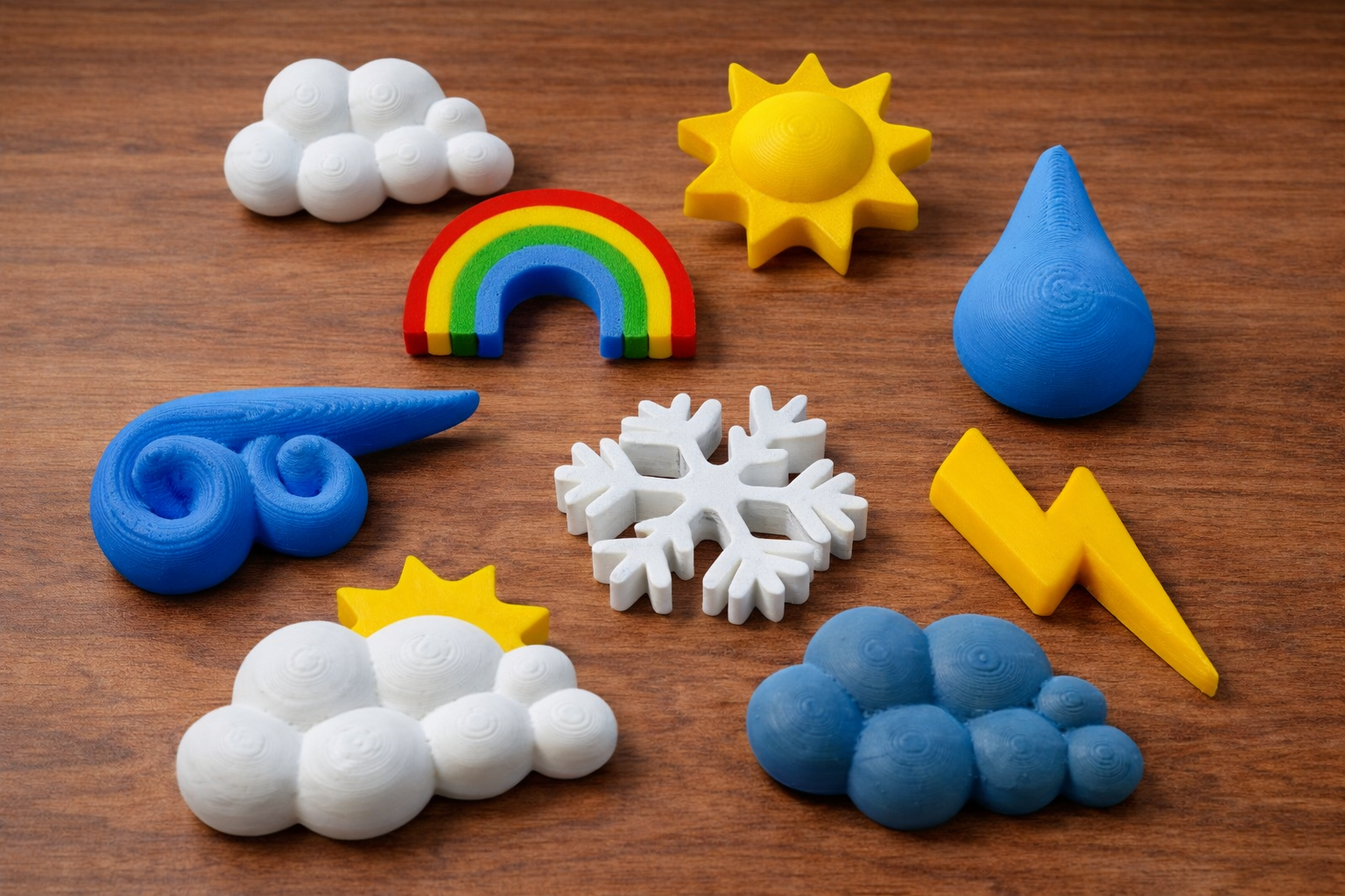 Produkt obsahuje: slunce, bílý mrak, šedý mrak, mrak se sluncem, duha, blesk, vítr, kapka, vločka